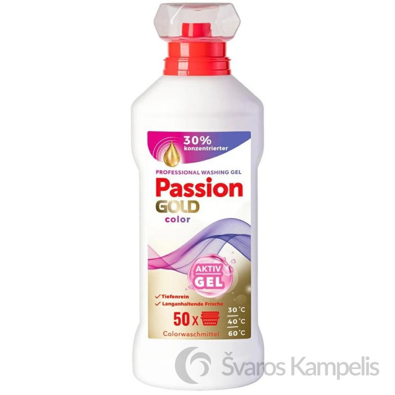 assion Gold Professional Color Activ gelis, skirtas spalvotiems audiniams skalbti. Inovatyvi plovimo formulė, giliai įsiskverbianti į pluoštus. Suteikia išskalbtiems audiniams malonų, gaivų kvapą. Sudėtyje yra aktyvių fermentų, kurie palaiko ir palengvina skalbimą. Visų tipų skalbimo mašinoms ir skalbimui rankomis. Skalbti nuo 30°C iki 60°C temperatūroje.