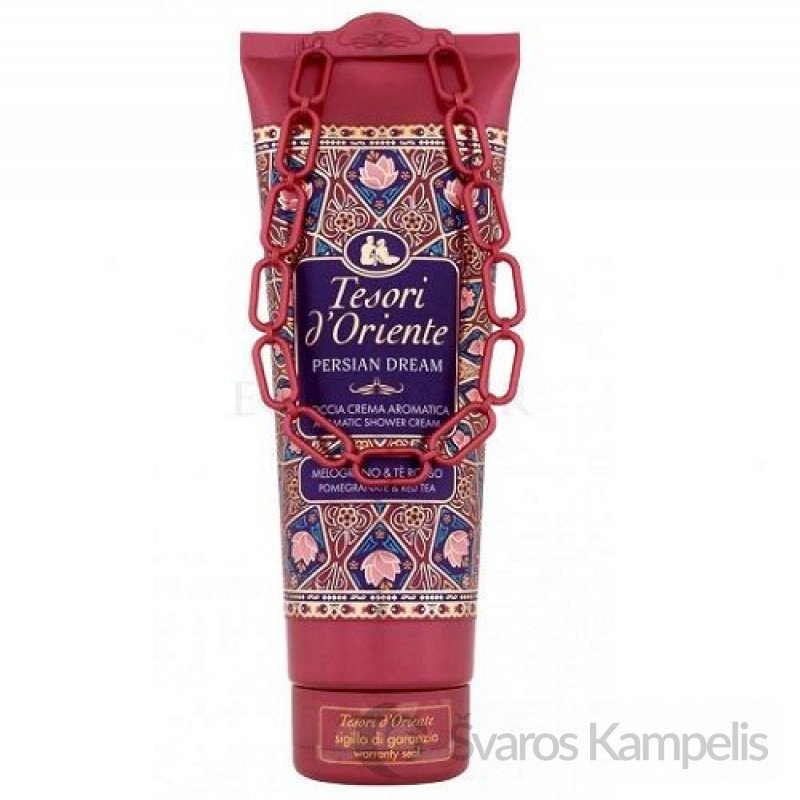 Itališka dušo želė! Prekės ženklas Tesori yra turtingas įvairių rūšių unikalios kosmetikos moterims ir vyrams. Siekiant užtikrinti geriausią komfortą ir patirtį maudymosi metu, gaminiai gaminami iš geriausių, atrinktų ingredientų. Kreminės konsistencijos dėka dušo želė giliai drėkina ir efektyviai valo kūną. Miros: palieka subtilų miros kvapą. Miško ritualas: baltos vandens lelijos kvapas su citrusinio medžio hinoki medienos akcentu Aegyptus: naujas mėlynosios Nilo lelijos kvapas. Ajurveda: pagrindinės kvapo natos nurodo vertingus natūralius elementus, tokius kaip pačiulių aliejus ir amla (indiška agrasta). Muschio Bianco: Su juo galite pasiduoti gintarui ir harmoningoms baltojo muskuso natoms. Japoniški ritualai: intensyvus ir jausmingas aromatas, sustiprintas gėlių bijūnų natomis Persų svajonė: kilnus granatų ekstrakto ir raudonosios arbatos mišinys. Orchidėja: Šimtmečius laikyta afrodiziaku, kinų orchidėja yra subtilumo ir elegancijos simbolis.